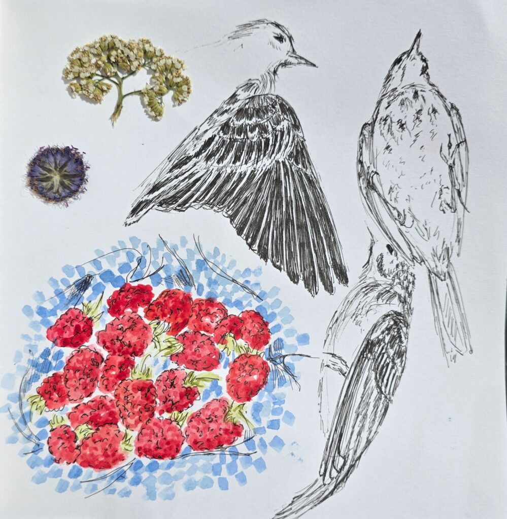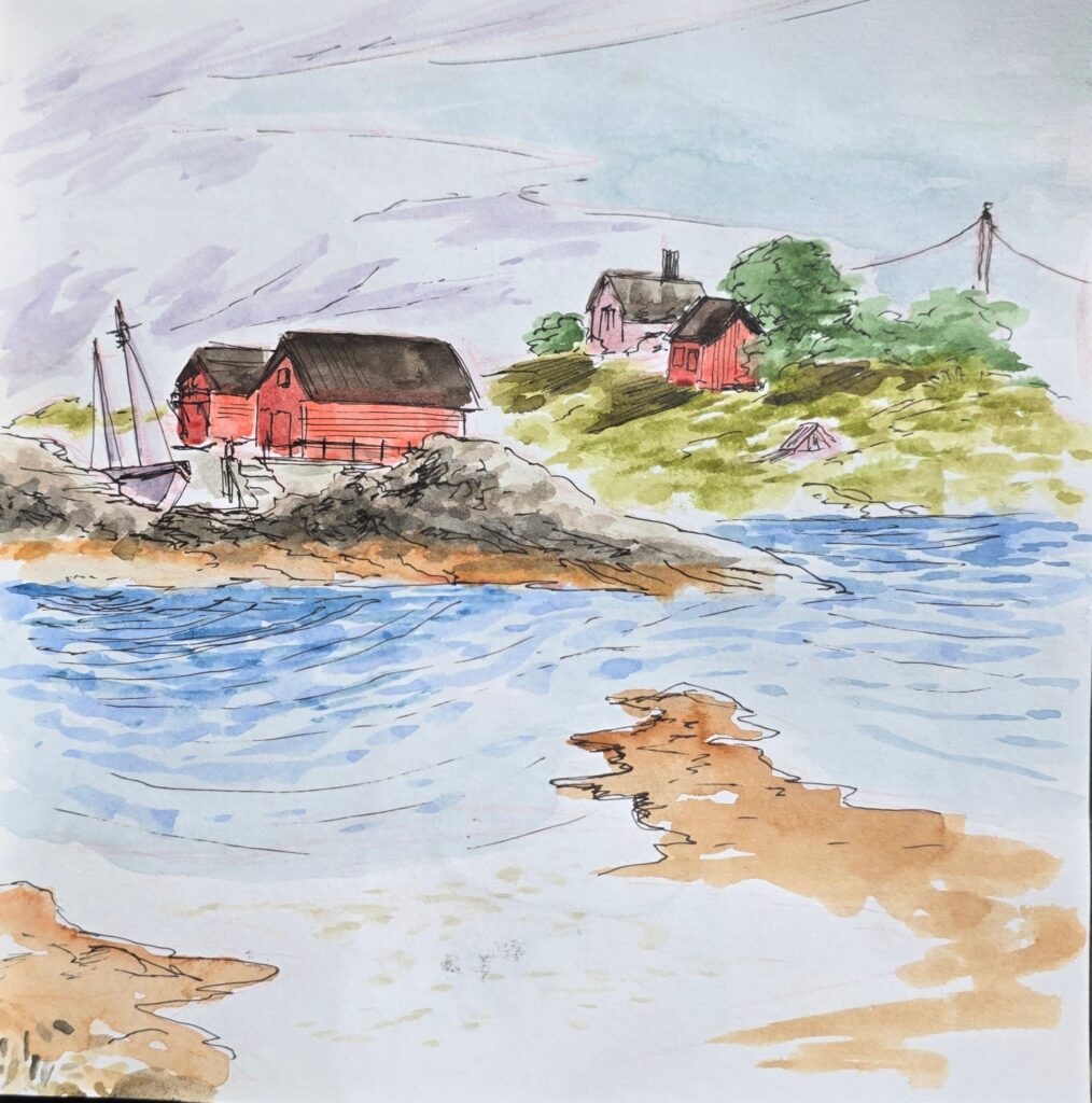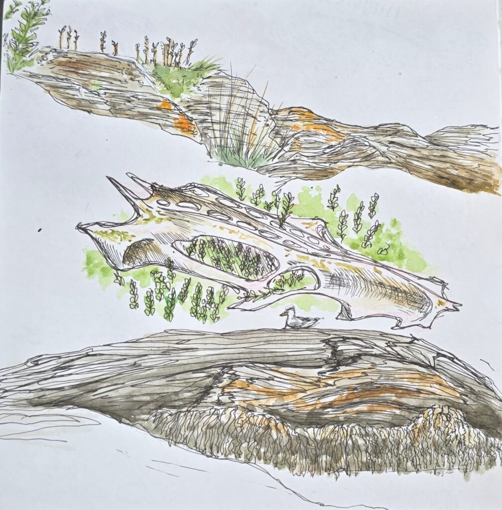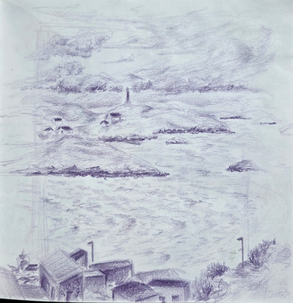 The breathtaking view and the wonderful company inspired me to go beyond my original plan of working on my short film, but also to reconnect with my painting and illustration background. Between working on the communal room, with my usual setup, I would embark on long walks around the hills and rocky seashore paths along the island, carrying my sketchbook and capturing what I saw.